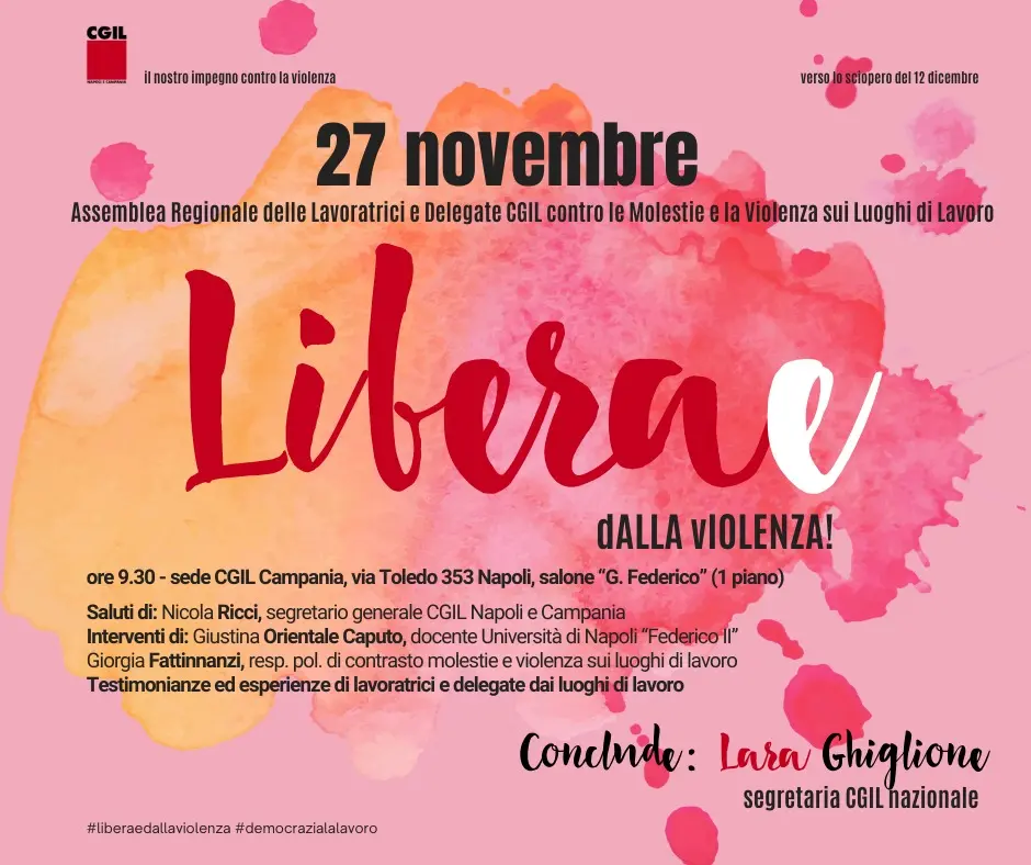 Il 27 novembre si terrà invece “Liberae”, la prima assemblea regionale monotematica delle lavoratrici iscritte e delle delegate Cgil Napoli e Campania sul tema delle molestie e della violenza dentro e fuori i luoghi di lavoro. L’iniziativa, in programma alle 9,30 nel salone “Gianfranco Federico” della Cgil Campania a Napoli, sarà aperta dal segretario generale Cgil Napoli e Campania, Nicola Ricci, con gli interventi della docente dell’Università degli studi “Federico II” di Napoli, Giustina Orientale Caputo, della responsabile al contrasto delle molestie e delle violenze sui luoghi di lavoro della Cgil nazionale, Giorgia Fattinnanzi. A concludere l’assemblea la segretaria confederale Cgil, Lara Ghiglione.
