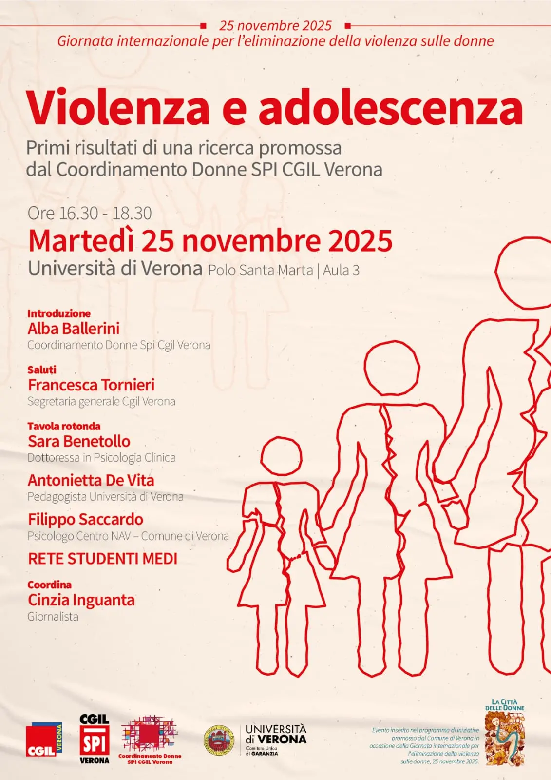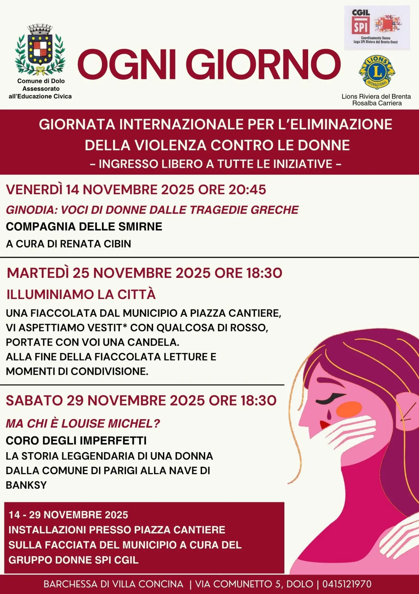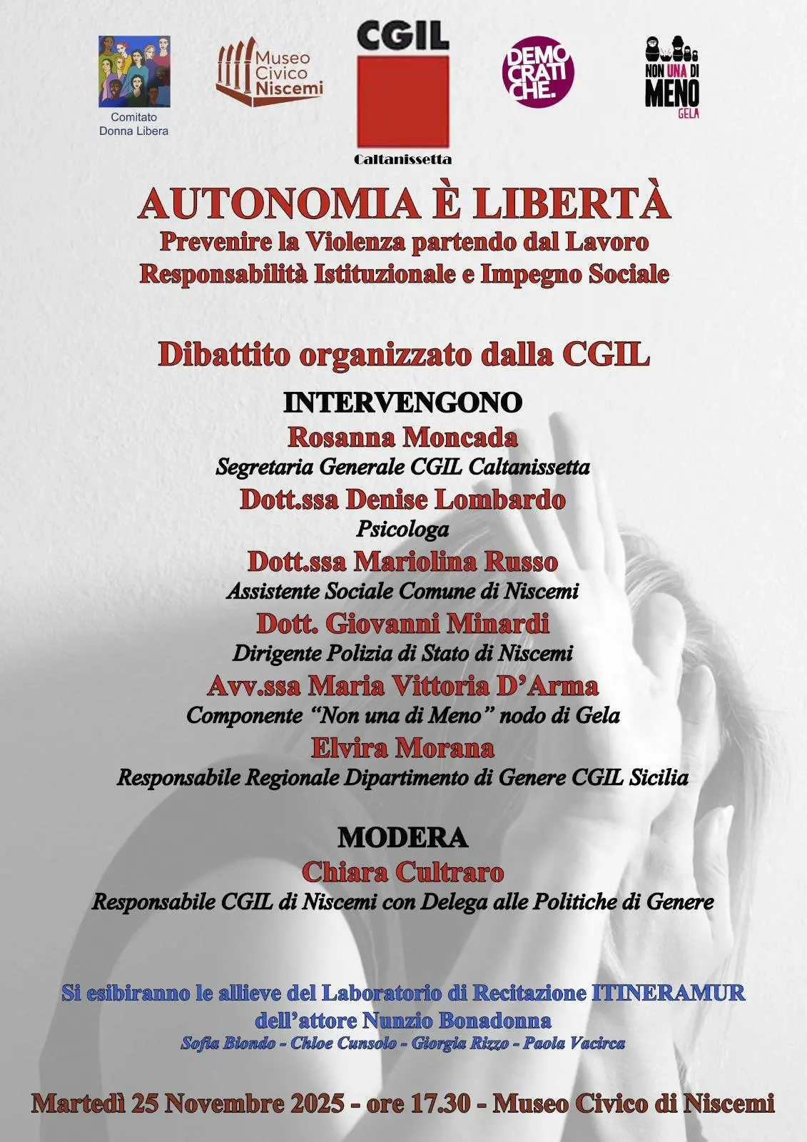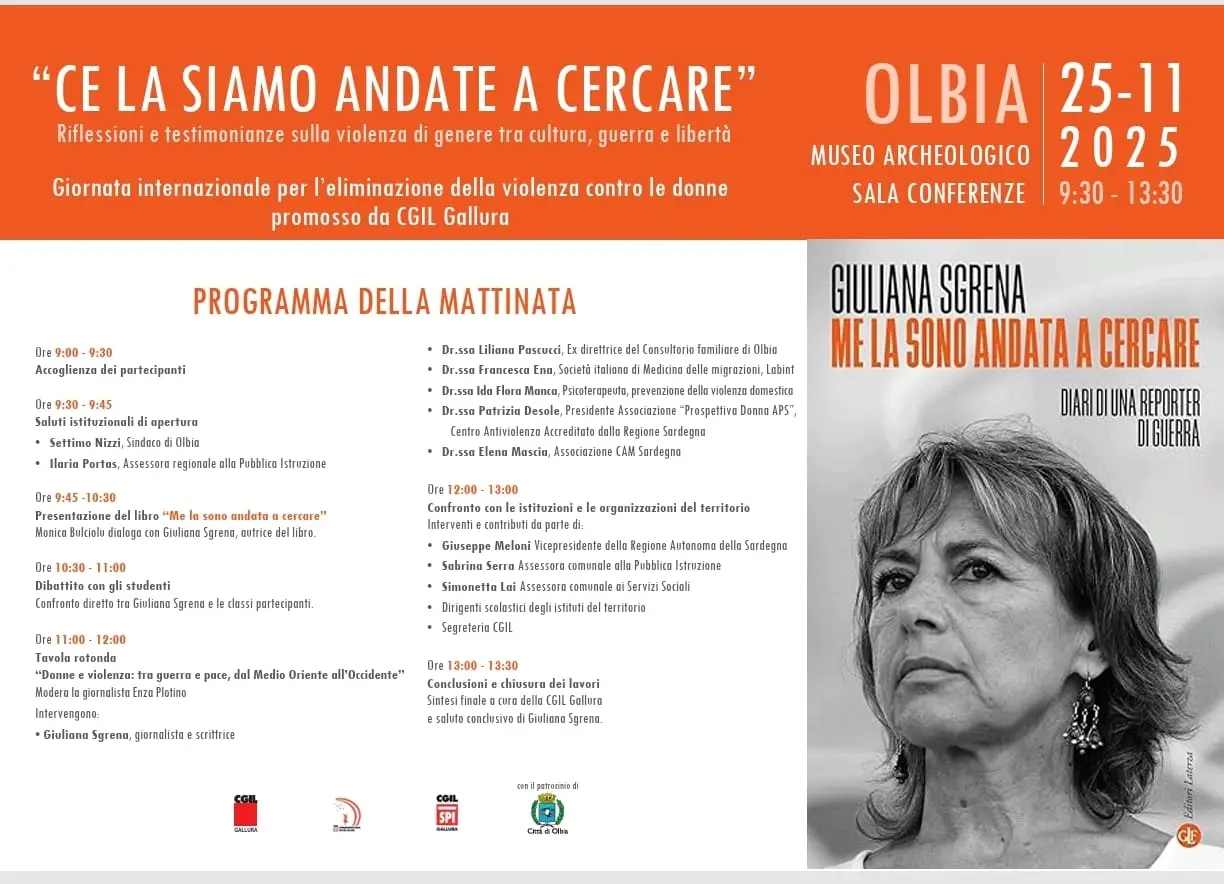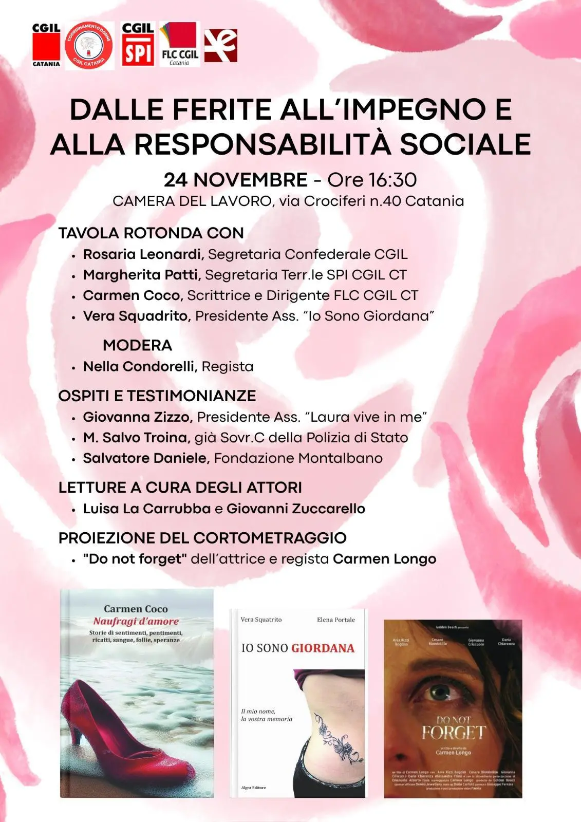Il percorso si aprirà il giorno precedente, 24 novembre alle 16.30, con l’iniziativa “Dalle ferite all’impegno e alla responsabilità sociale”, ospitata presso la Camera del Lavoro di via Crociferi. La tavola rotonda vedrà la partecipazione di Rosaria Leonardi, segretaria confederale Cgil, Margherita Patti, segretaria territoriale Spi Cgil Catania, Carmen Coco, autrice del libro “Naufragi d’amore” e dirigente Flc Cgil Catania, Vera Squadrito (mamma della giovane Giordana Di Stefano,vittima di femminicidio) e autrice, insieme a Elena Portale, del libro “Io sono Giordana”, nonché presidente dell’omonima associazione.