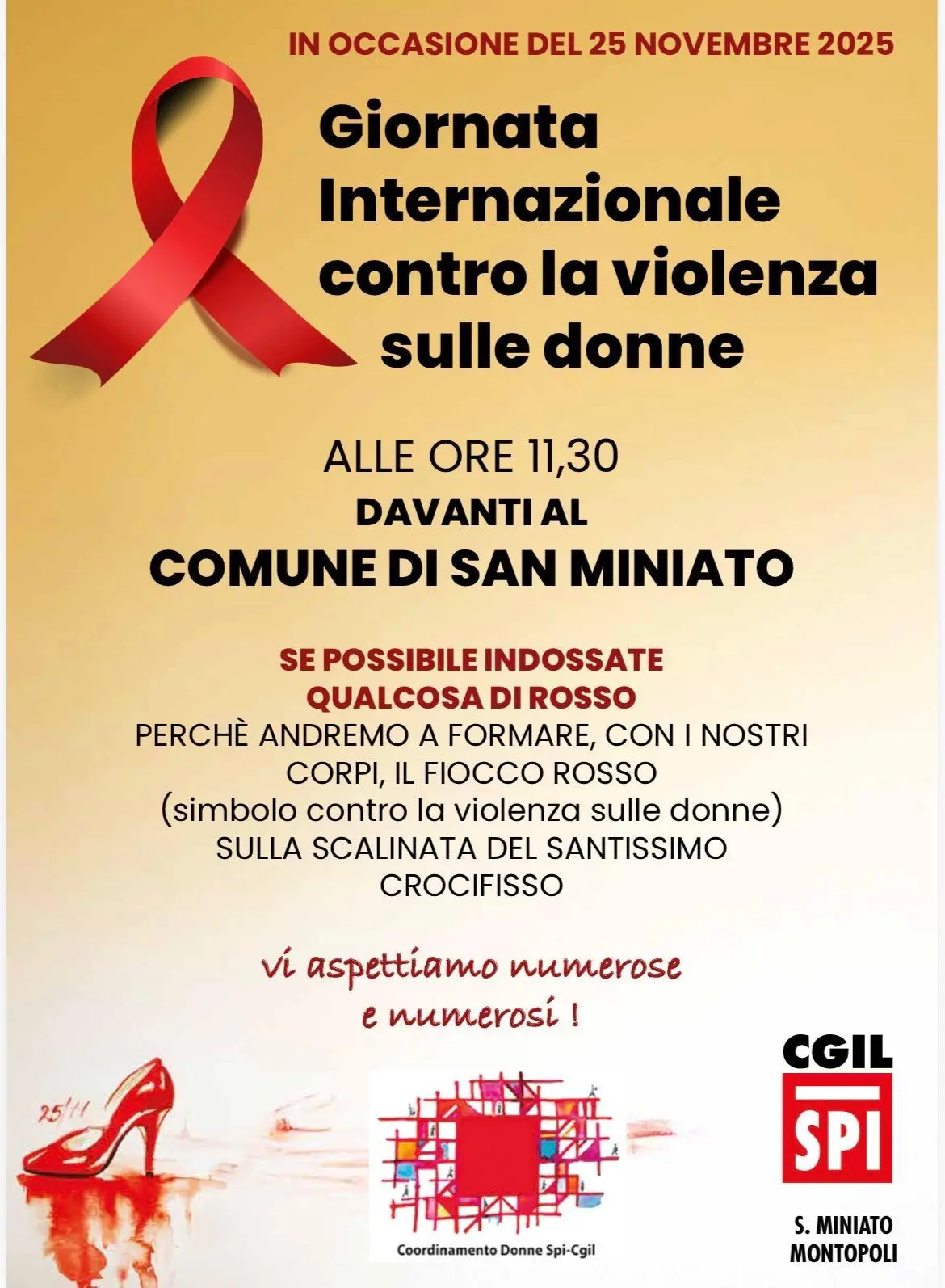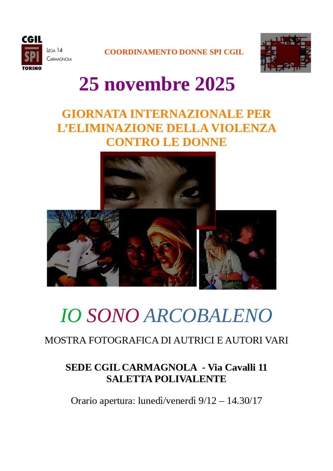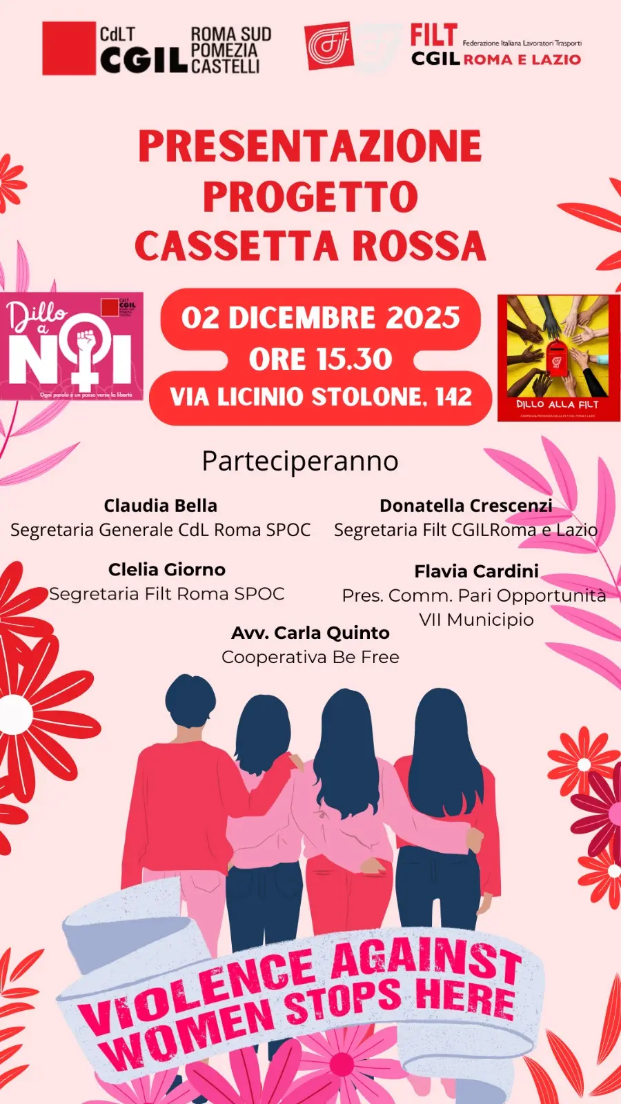 Alle ore 17 in Largo Pertini il flash mob “Tuttə unitə contro la violenza sulle donne” organizzato dalla Camera del Lavoro di Genova in occasione della giornata internazionale per l’eliminazione della violenza contro le donne. La Camera del lavoro di Genova si fa capofila nell'organizzazione di un flash mob al quale parteciperanno partiti, associazionismo, cittadine e cittadini. Durante il flash mob, mani dipinte di rosso reggeranno cartelli con messaggi contro la violenza e in solidarietà a tutte le donne.