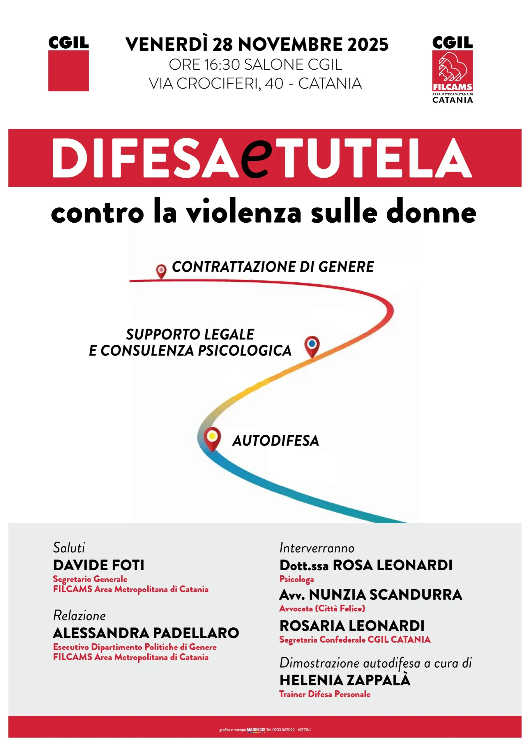 Ecco il dettaglio degli appuntamenti. Il 25 novembre alle 9,30, nel salone Russo della Cgil (via Crociferi 40), spazio all’assemblea delle delegate delle categorie, interamente dedicata al tema “La violenza sulle donne nel mondo del lavoro: discriminazioni, molestie, mobbing”. L’incontro nasce dall’urgenza di far emergere le esperienze troppo spesso taciute delle lavoratrici, che quotidianamente subiscono pressioni, ricatti, molestie verbali e fisiche, insieme a discriminazioni che minano dignità, autonomia professionale e sicurezza personale. Apriranno i lavori Carmelo De Caudo, segretario generale Cgil Catania, e Rosaria Leonardi, segretaria confederale della Cgil. Seguiranno gli interventi di Adriana Laudani, presidente “Memoria e Futuro”, Anna Agosta, presidente dell’associazione “Thamaia”, Giulia Renda, coordinatrice Udu Catania, Pina Palella, presidente provinciale Anpi Catania, Luigi Nicolosi, coordinatore “Koinè” Catania. I lavori saranno chiusi dal monologo “Non sono nata per avere paura”, interpretato da Tiziana Grasso, che restituisce con forza la complessità delle dinamiche di prevaricazione subite dalle donne. Concluderà i lavori Gabriella Messina, segretaria regionale Cgil Sicilia.