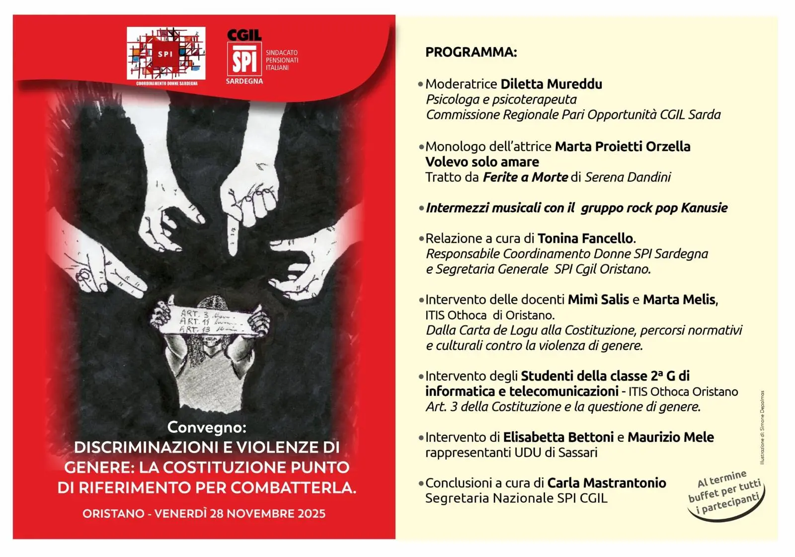 Di questi temi si parlerà nel convegno “Il coraggio di ascoltare, il dovere di agire”, organizzato per il 25 novembre dalla Cgil Udine. L’appuntamento è alle 9 nella sala riunioni della Camera del lavoro di via Bassi 36 e vedrà gli interventi della stessa Daniela Duz e di Maria Cartolano per la Cgil, di Arianna Facchini, assessore alla demografia e alle pari opportunità del Comune di Udine, di Erica Pillinini, psicologa e psicoterapeuta, di Calogero Anzallo, psichiatra, dell’avvocata Andreina Baruffini Gardini, della magistrata Annunziata Puglia, delle consigliere regionali Manuela Celotti e Serena Pellegrino.