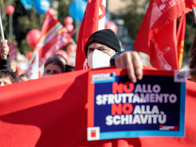 Volti e immagini da piazza del Popolo, nel giorno dello sciopero generale indetto da Cgil e Uil contro la manovra del governo Draghi: "Tutti insieme per combattere una pandemia salariale e sociale che non ha precedent"