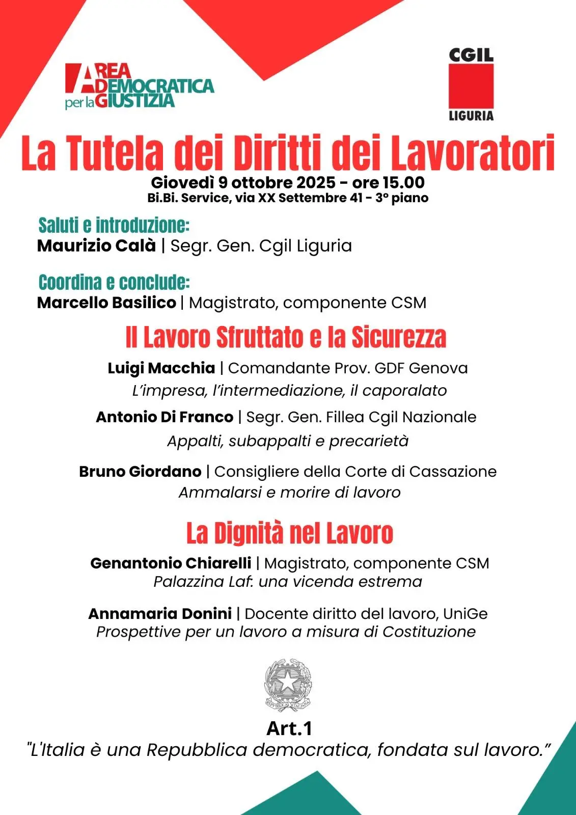 A Genova, giovedì 9 ottobre alle ore 15, presso il Bi.Bi Service di Via XX Settembre 41 si terrà il convegno “La tutela dei diritti dei lavoratori”, organizzato dall’associazione Area per la giustizia democratica e Cgil Liguria.