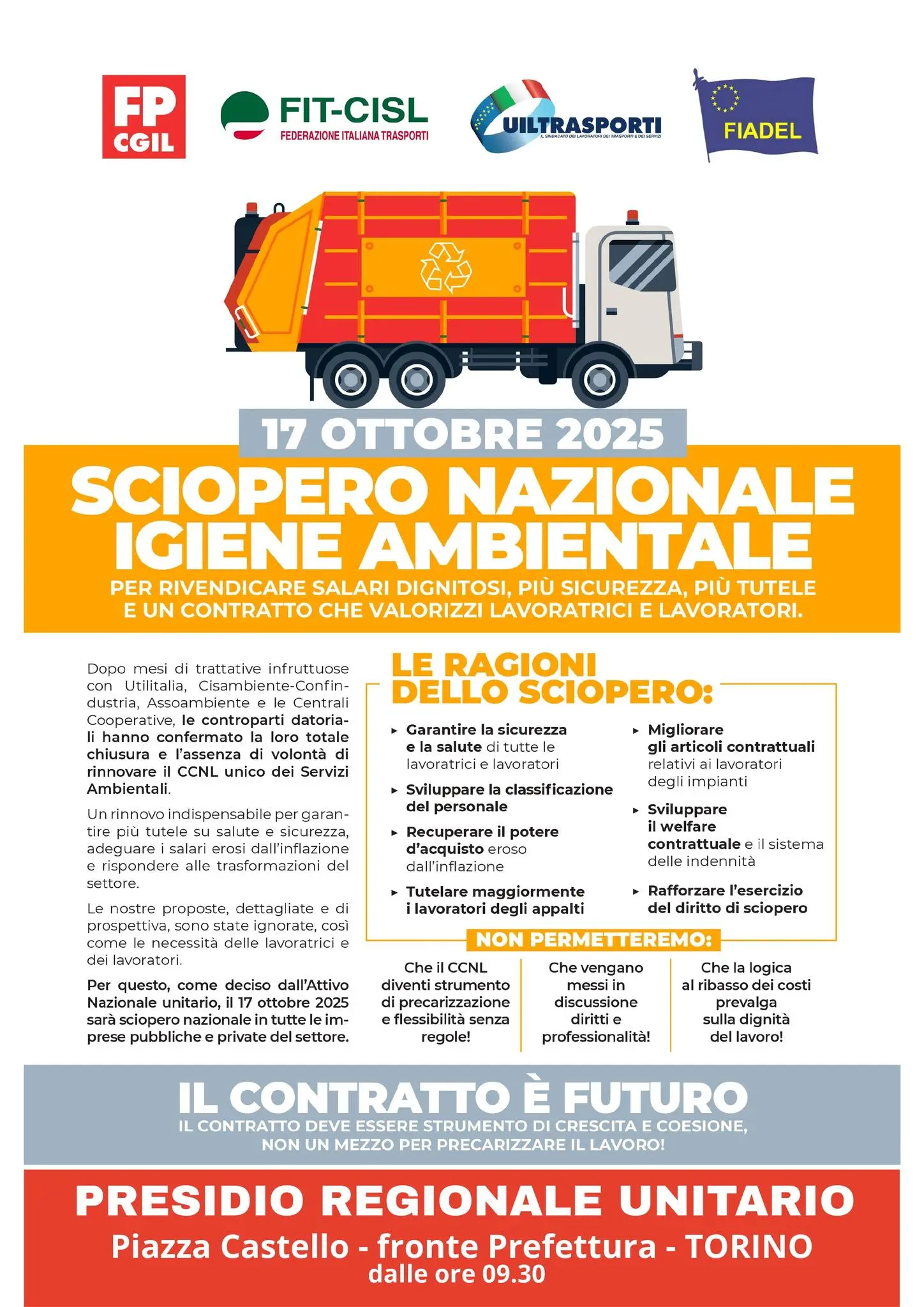 Il 17 ottobre, in occasione dello sciopero nazionale igiene ambientale per il rinnovo del contratto, presidio regionale per l’Abruzzo presso la Prefettura di Pescara in Via Piazza Italia alle ore 10,00.