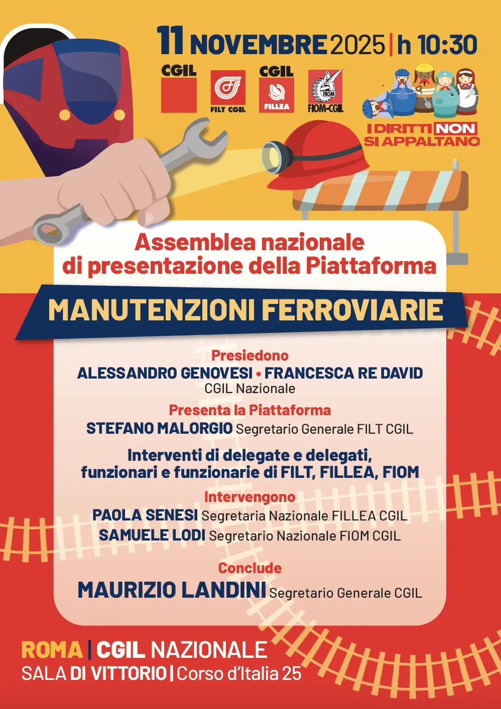 Si terrà martedì 11 novembre a Roma, nel salone “Di Vittorio” della Cgil nazionale, l’assemblea unitaria promossa da Cgil, Filt, Fillea e Fiom dedicata al settore delle manutenzioni ferroviarie. L’incontro sarà concluso dal segretario generale Maurizio Landini e rappresenterà un passaggio cruciale per la costruzione di una vertenza nazionale in un comparto strategico per la sicurezza, la qualità del lavoro e la sostenibilità del trasporto ferroviario.
