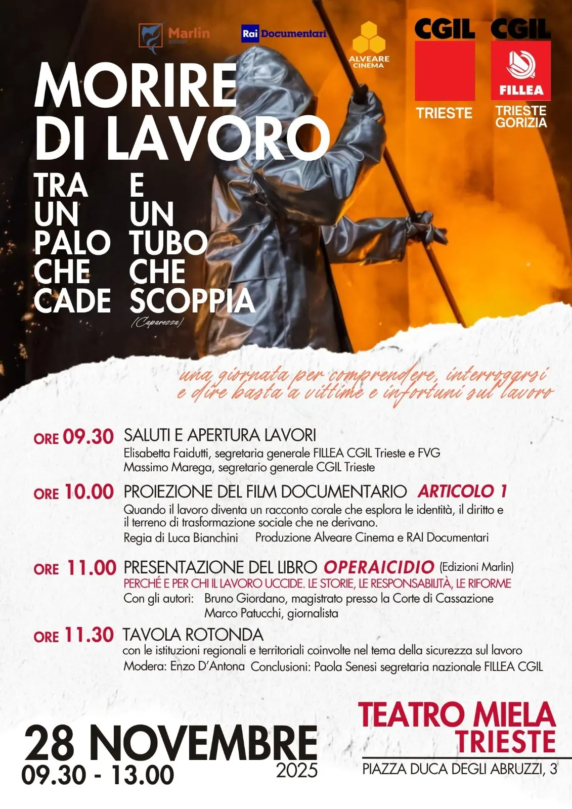 Il 28 novembre al teatro Miela di Trieste la Fillea Trieste e Gorizia, organizzazione storicamente impegnata nella promozione della sicurezza, della prevenzione e della tutela dei diritti delle lavoratrici e dei lavoratori, presenta un convegno dedicato al lavoro nella sua accezione più triste e drammatica, infortuni e morti.