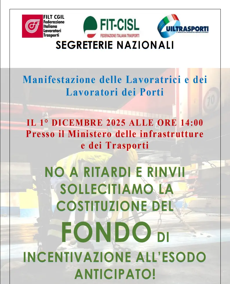 Da 5 anni i lavoratori portuali attendono l’istituzione del fondo di accompagno all’esodo e il riconoscimento del lavoro usurante. È un impegno sottoscritto nel rinnovo del contratto collettivo nazionale di lavoro e anche una previsione di legge, “ma questi due elementi non sono bastati a rendere esigibile il Fondo”, come fanno sapere la Filt Cgil, Fit Cisl Uil Trasporti indicendo una manifestazione davanti al ministero delle Infrastrutture e dei Trasporti per lunedì 1 dicembre.