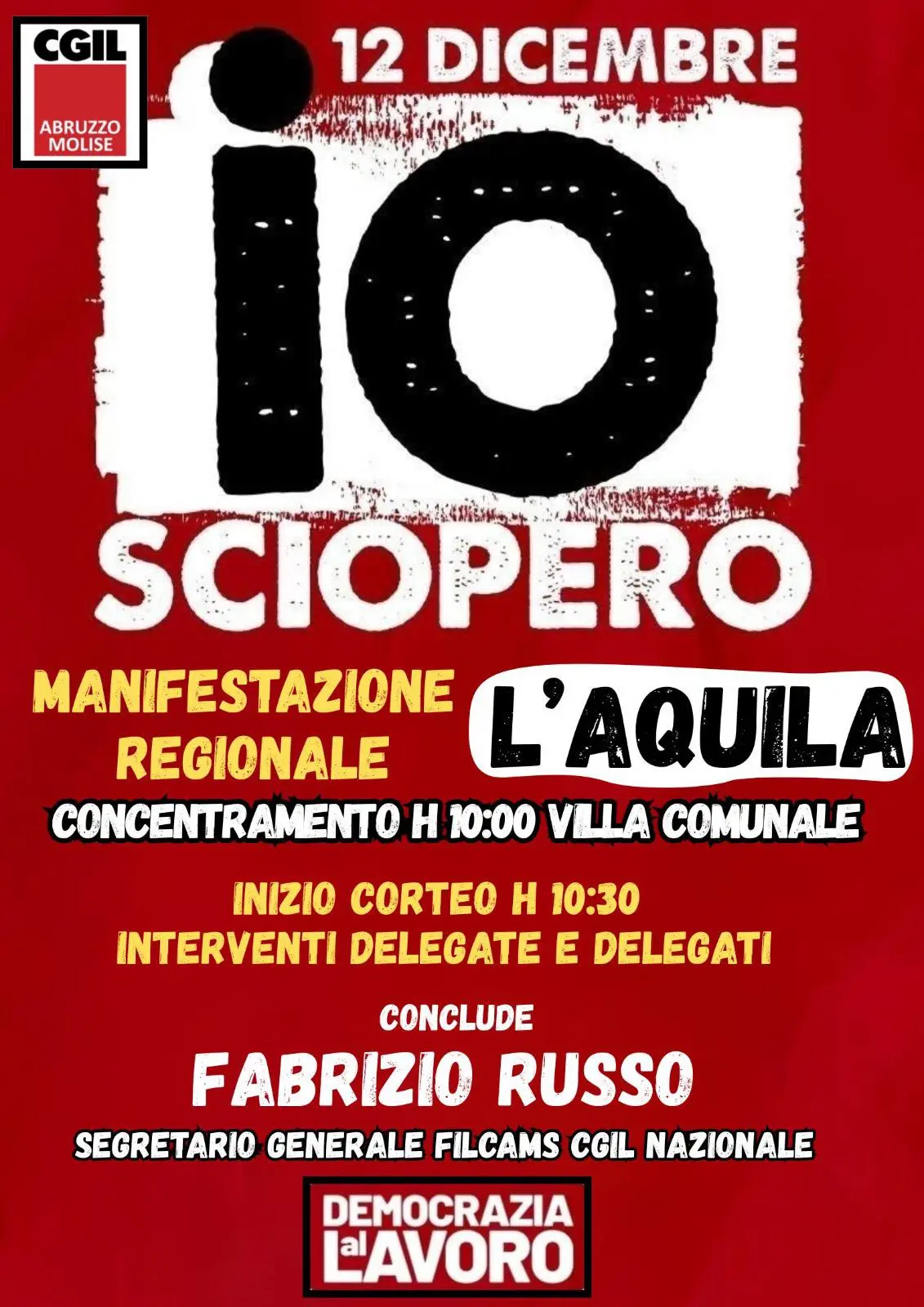 Manifestazione regionale a L’Aquila. Concentramento alle ore 10:00 alla Villa Comunale. Conclusioni di Fabrizio Russo, segretario generale Filcams Cgil nazionale.