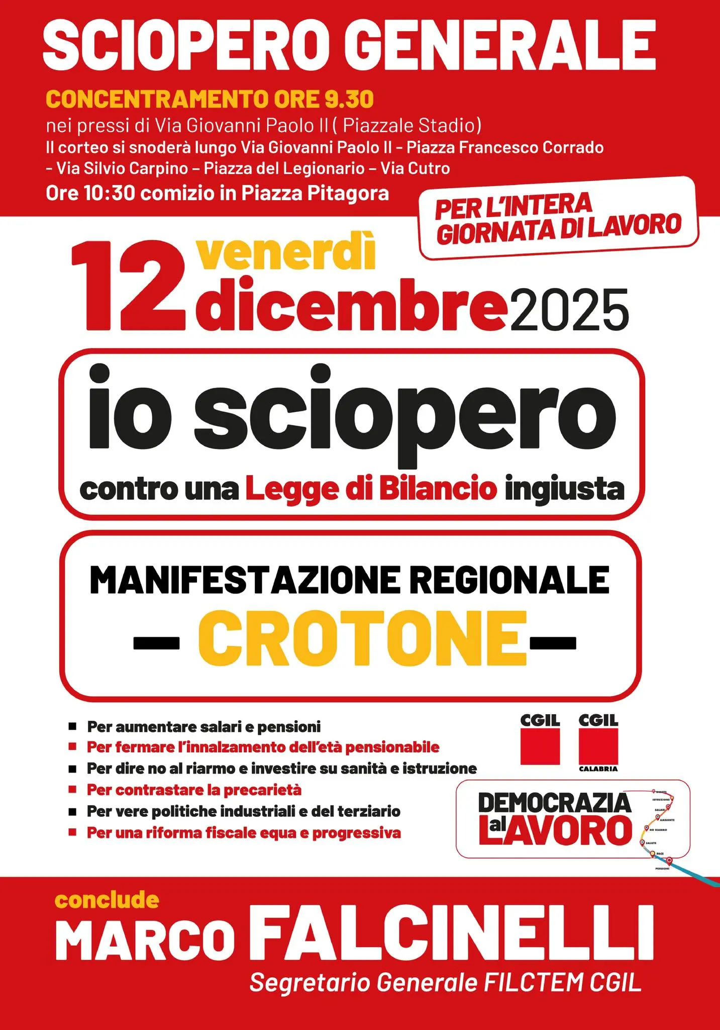 Manifestazione regionale con concentramento alle ore 9:30 a Crotone nei pressi di Via Giovanni Paolo II (Piazzale Stadio) e comizio alle ore 10:30 in Piazza Pitagora. Conclusioni affidate a Marco Falcinelli, segretario generale della Filctem Cgil nazionale.