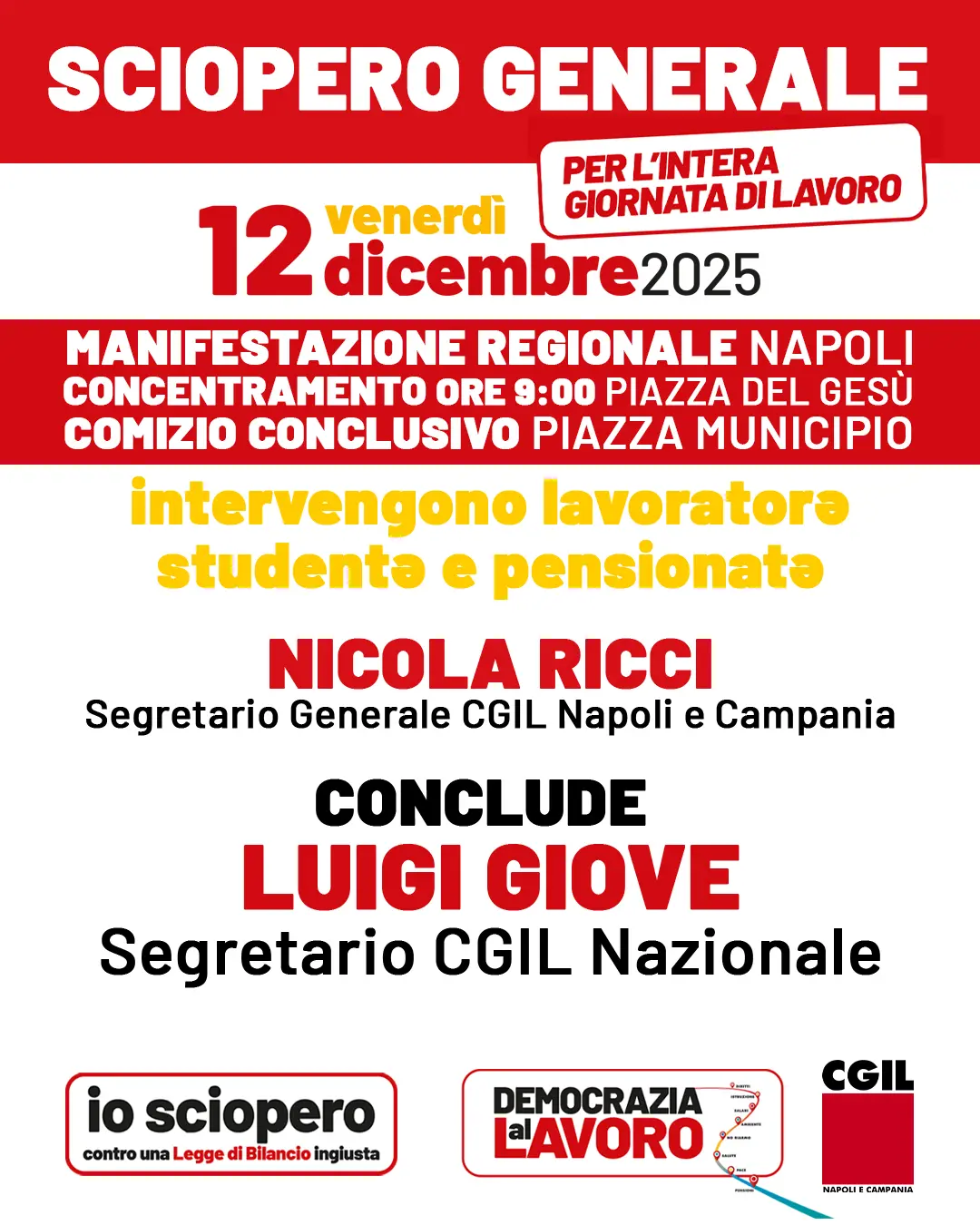 Manifestazione regionale a Napoli. Concentramento ore 9:00 Piazza del Gesù. Comizio in Piazza Municipio. Conclude Luigi Giove, segretario confederale della Cgil nazionale.