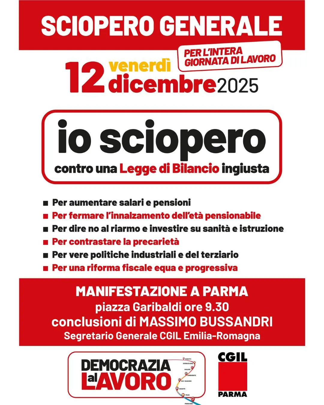 A Parma manifestazione in Piazza Garibaldi alle ore 9:30. Il comizio sarà concluso da Massimo Bussandri, segretario generale della Cgil Emilia-Romagna.