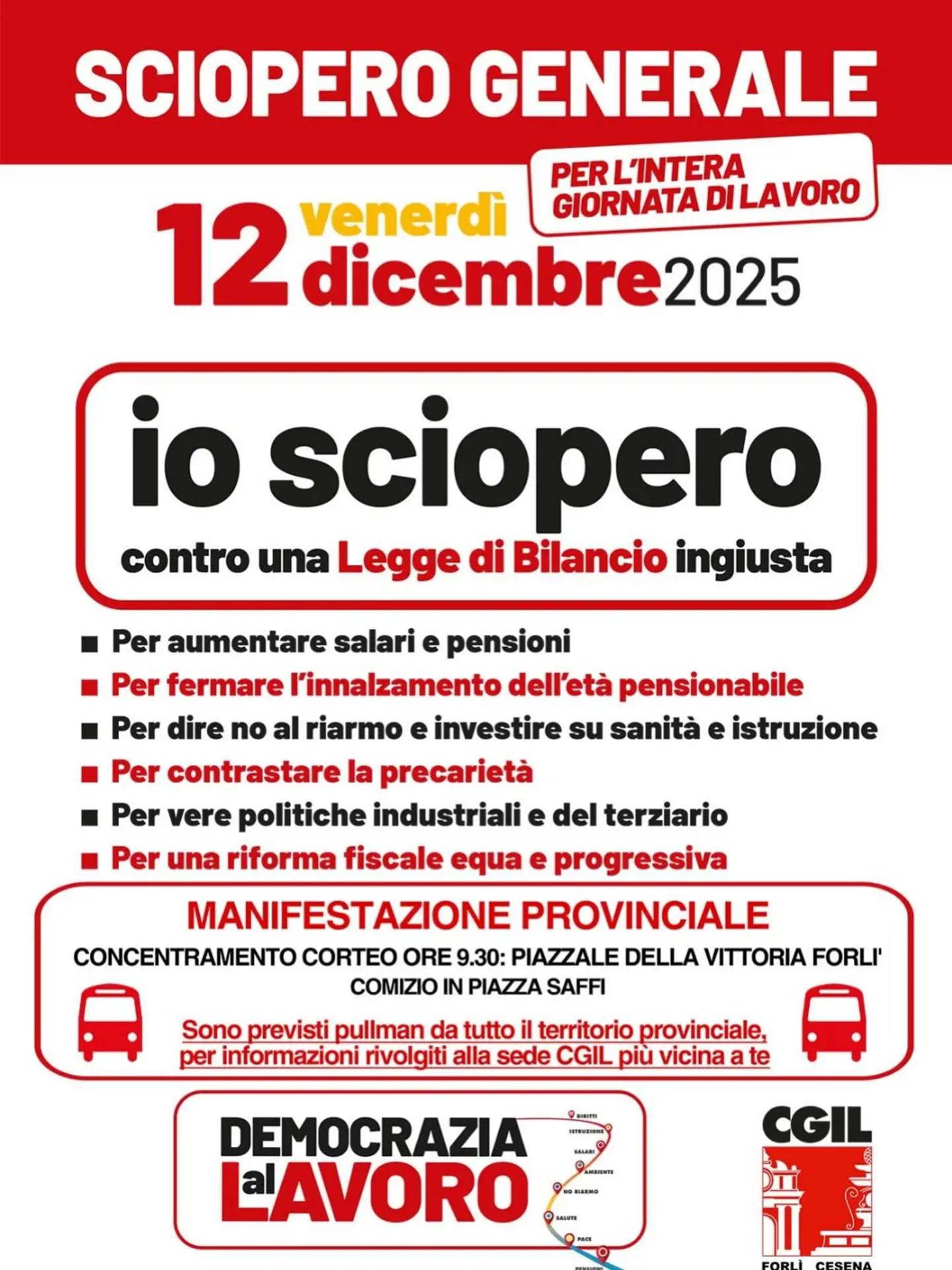 La Cgil di Forlì Cesena ha dato appuntamento a tutte e tutti alle ore 9:30 a Forlì in Piazzale della Vittoria. Il comizio si terrà in Piazza Saffi.