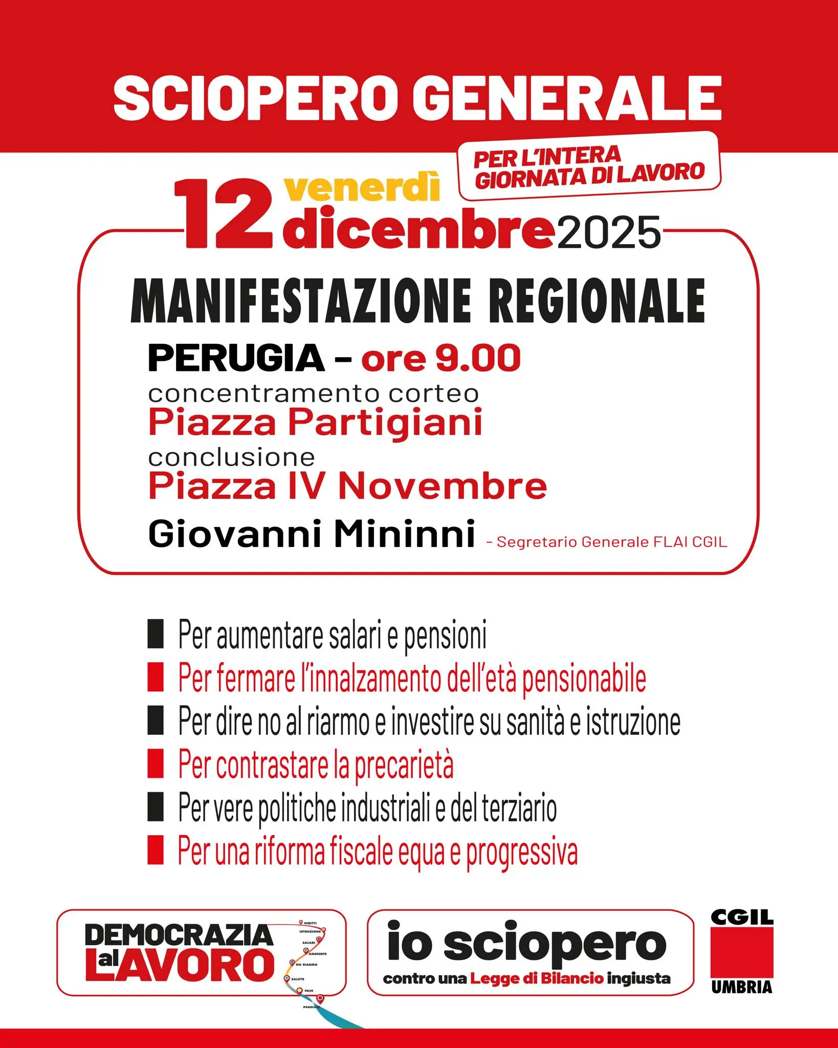 Manifestazione regionale a Perugia con concentramento in Piazza dei Partigiani alle ore 9:00 e corteo fino a Piazza IV Novembre. Conclusioni affidate a Giovanni Mininni, segretario generale della Flai Cgil nazionale.