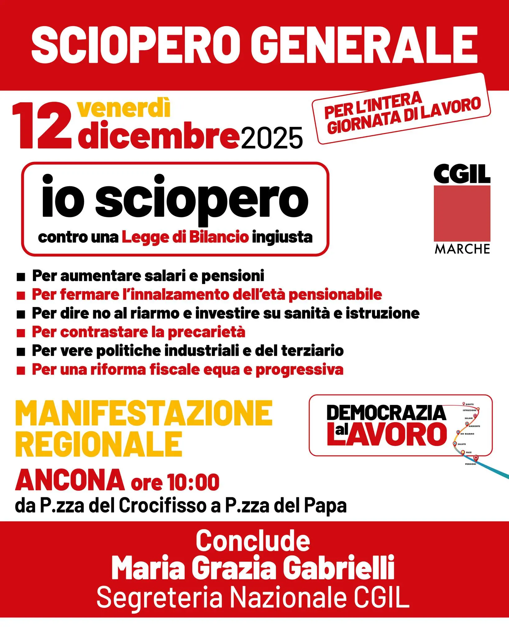 Manifestazione regionale ad Ancona. Il corteo partirà alle ore 10:00 da Piazza del Crocifisso e arriverà a Piazza del Papa. Conclude Maria Grazia Gabrielli, segretaria confederale della Cgil nazionale.
