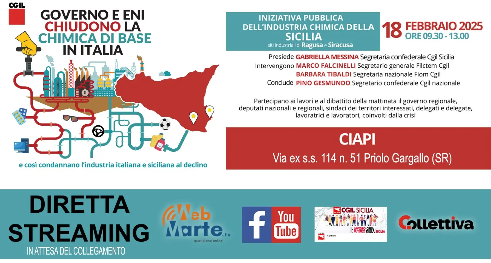Interverranno al dibattito rappresentanti delle istituzioni regionali, deputati nazionali, esperti, lavoratori e lavoratrici coinvolti nella crisi. Eni, ricorda una nota della Cgil Sicilia, ha deciso di chiudere dal primo gennaio la produzione a Versalis a Ragusa e dal 31 dicembre 2025 quella a Priolo, prospettando indefiniti progetti di reindustrializzazione. “Un progetto di dismissione – si legge nella nota –paradossalmente avallato dal governo, dal momento che Eni è un’azienda partecipata dallo Stato. Eni decide come un qualsiasi fondo di investimento privato estero di togliere al Paese, con l’avallo del Governo nazionale e il silenzio del Governo Regionale, l’asse portante dell’assetto industriale, quali sono appunto i cracking, e offre in cambio una nuova bioraffineria e solo una serie di titoli senza alcuna garanzia per lo sviluppo e gli occupati”.