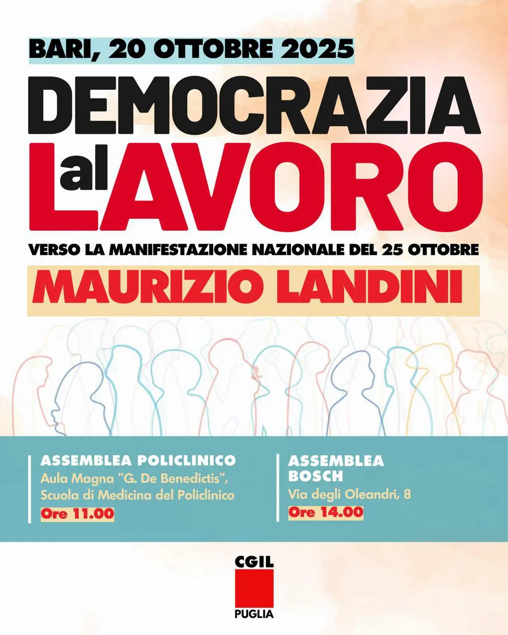 Oggi, lunedì 20 ottobre, il segretario generale della Cgil nazionale, Maurizio Landini, è a Bari dove partecipa a due assemblee: la prima al Policlinico, dalle ore 11, nell’Aula Magna “De Benedictis” della Scuola di Medicina; la seconda alla Bosch nella zona industriale, dalle ore 14. L’incontro con lavoratori e lavoratrici della sanità e della metalmeccanica si inserisce nel corso della mobilitazione lanciata dalla Cgil dal titolo “Democrazia al lavoro” e che vedrà il sindacato tenere una manifestazione nazionale sabato 25 ottobre a Roma.