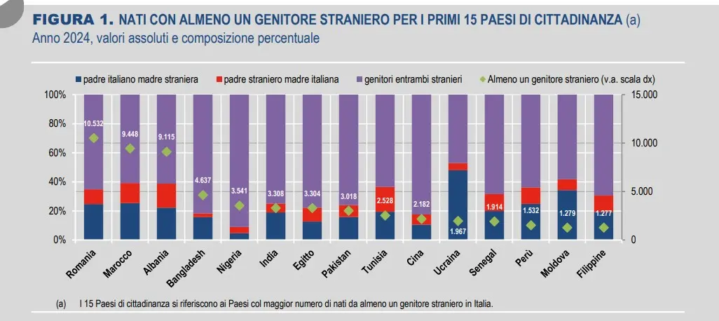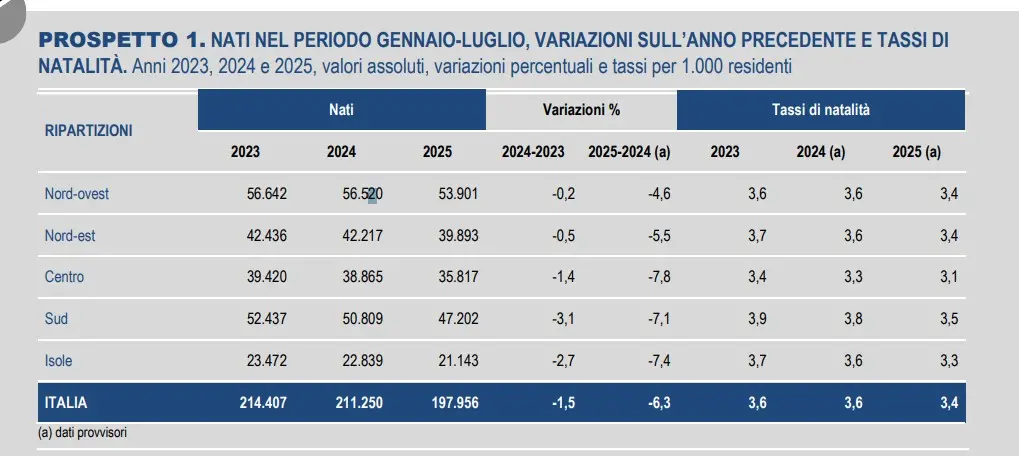 Nelle regioni del Centro Italia si registra il tasso di fecondità più basso, mentre le regioni che hanno registrato il calo più intenso sono l’Abruzzo (-10,2%) e la Sardegna (-10,1%).Tra le altre regioni che presentano una diminuzione del numero delle nascite, si rilevano l’Umbria (-9,6%), il Lazio (-9,4%) e la Calabria (-8,4%). Le diminuzioni meno intense si sono osservate in Basilicata (-0,9%), nelle Marche e in Lombardia (rispettivamente - 1,6% e -3,9%). Le sole regioni a registrare un aumento sono, secondo i dati provvisori, la Valle d’Aosta/Vallée d’Aoste (+5,5%) e le Province autonome di Bolzano/Bozen (+1,9%) e di Trento (+0,6%). Infine, è da notare come, mentre le coppie con entrambi i genitori italiani fanno meno figli, il numero dei nati da genitori in cui almeno uno è straniero resta sostanzialmente stazionario rispetto all’anno precedente. Queste nascite costituiscono il 21,8% del totale dei nati.