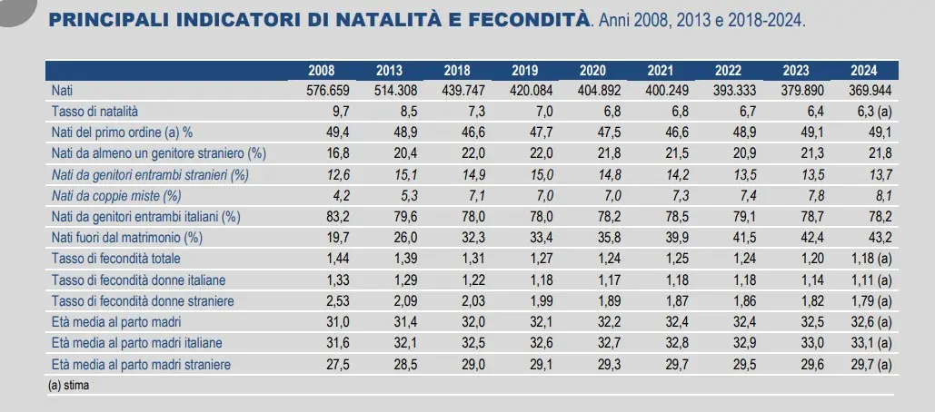 Tutti gli indicatori sono bassi e concorrono gli uni con gli altri ad aggravare la curva della natalità. È bassa la propensione ad avere figli: 1,18 figli in media per donna nel 2024, peggio per le italiane, il cui tasso di fecondità si attesta a 1,1 figlio per donna. È in diminuzione il numero dei potenziali genitori, appartenenti alle sempre più esigue generazioni nate a partire dalla metà degli anni Settanta, quando la fecondità cominciò a ridursi. Quindi pochi figli per donna e poche donne che possono fare figli. Infine, si ritarda sempre più la nascita del primo figlio. Nel 2024 si attesta al compimento del 32,6 anni.