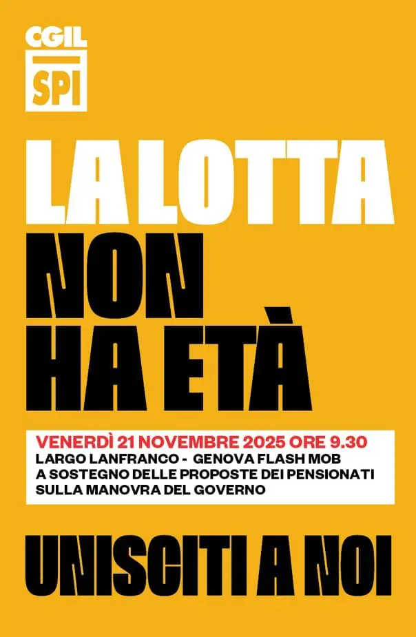 Il flash mob rientra nella settimana di mobilitazione nazionale dello Spi Cgil, che dal 17 al 21 novembre ha promosso in tutta Italia centinaia di volantinaggi, assemblee, incontri pubblici e presidi. In Liguria Genova chiude un percorso che ha visto la prima iniziativa martedì 18 Savona, il 19 a La Spezia e il 20 Imperia.
