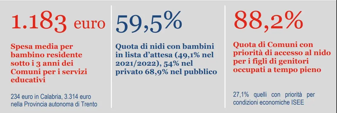 Alla carenza di posti, ai costi elevati dei servizi, ai divari territoriali si somma un ulteriore problema. Per Barbaresi è “la presenza di liste d’attesa consistenti e la tendenza all’aumento della domanda da parte delle famiglie, che non viene soddisfatta dalla capacità ricettiva del sistema educativo per la prima infanzia”. E a completare il quadro, “i troppi ritardi nella realizzazione dei progetti del Pnrr: a pochi mesi della scadenza è stato speso solo il 39% dei 3,8 miliardi di euro di finanziamenti per asili nido e scuole dell’infanzia, e solo l’8% delle opere risulta completato. Anche su questo il governo sembra piuttosto distratto”.