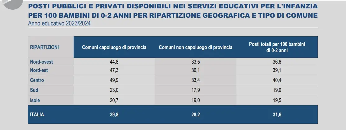 Quella dei divari territoriali è la preoccupazione della Cgil. Infatti la dirigente sindacale sottolinea che “preoccupano le pesanti diseguaglianze territoriali nella disponibilità di posti, che restano sostanzialmente inalterate, con ben sette regioni che non arrivano ancora al 33% nel rapporto posti/bambini: Abruzzo, Basilicata, Molise, Puglia, Calabria, Sicilia e Campania”.