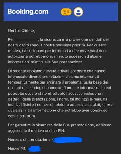 Se doveste ricevere messaggi via Whatsapp, tramite SMS o sulla vostra e-mail da parte di soggetti che si presentano come Booking o come la struttura ricettiva che avete prenotato e che chiedono qualsiasi vostro dato (soprattutto legato ai pagamenti), non rispondete, non cliccate su alcun link e ovviamente non effettuate alcun pagamento. Neanche se i riferimenti sono precisi e riguardano una vostra recente prenotazione (spear phishing, ricordate?).
