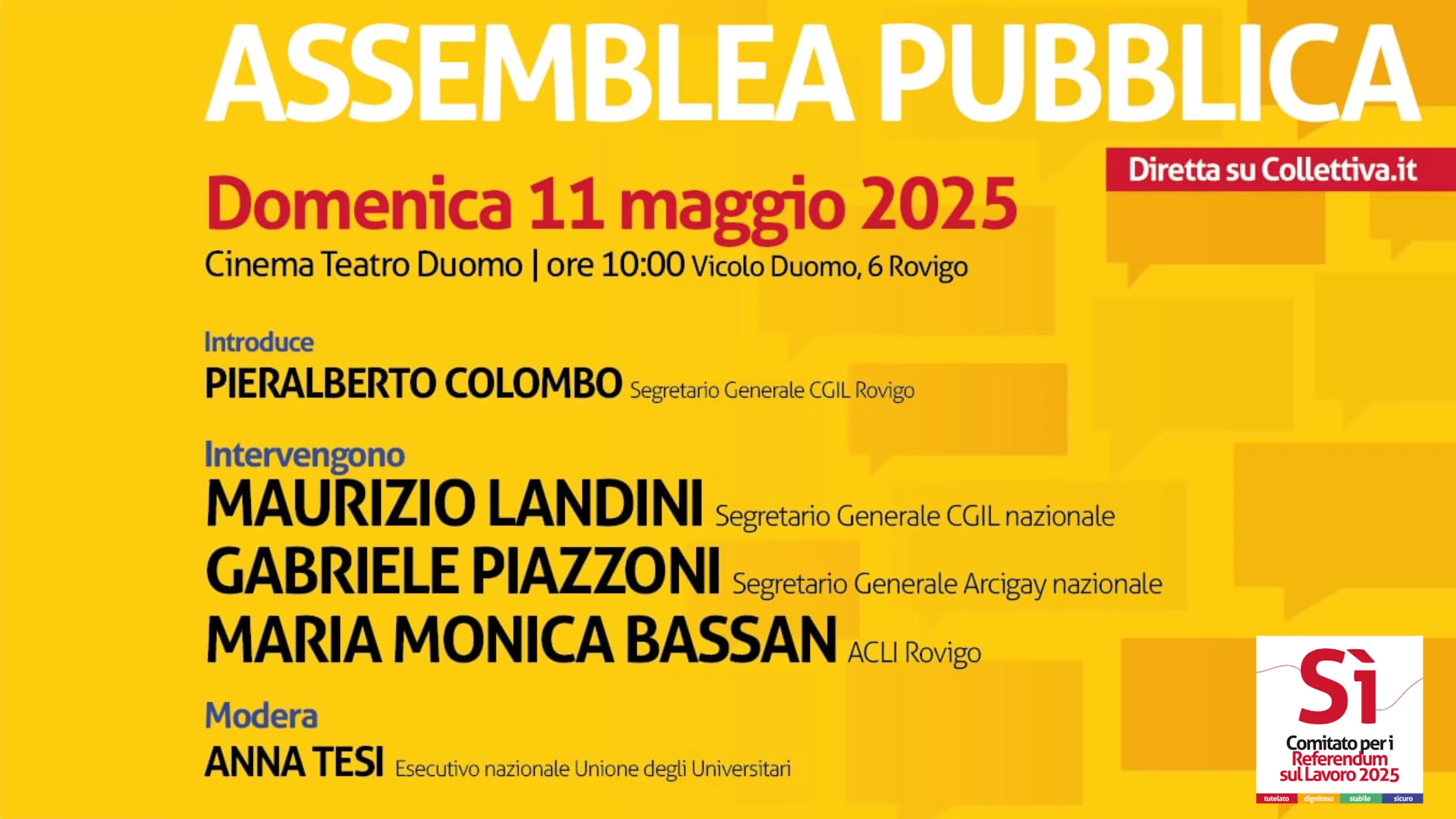 Si terrà domenica 11 maggio l’assemblea pubblica della Cgil di Rovigo, a partire alle ore 10 presso il Cinema Teatro Duomo. L’iniziativa, aperta a tutti, ha l’obiettivo di illustrare le ragioni del sì ai 5 referendum abrogativi dell’8 e 9 giugno prossimi.