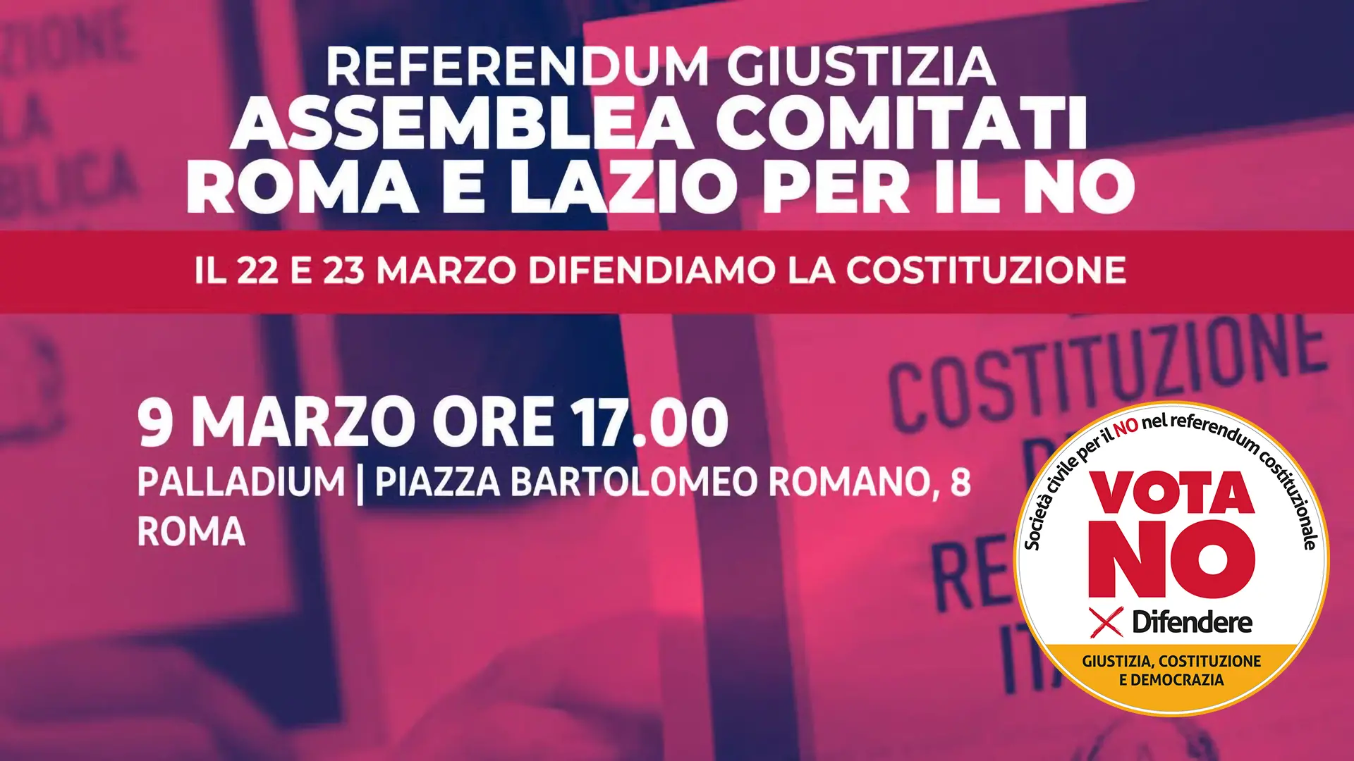 In vista del referendum sulla giustizia del 22 e 23 marzo, il Comitato della società civile di Roma e Lazio per il No promuove un’assemblea pubblica per informare, discutere e mobilitare le cittadine e i cittadini a difesa della Costituzione e della democrazia, respingendo la Legge Nordio-Meloni.