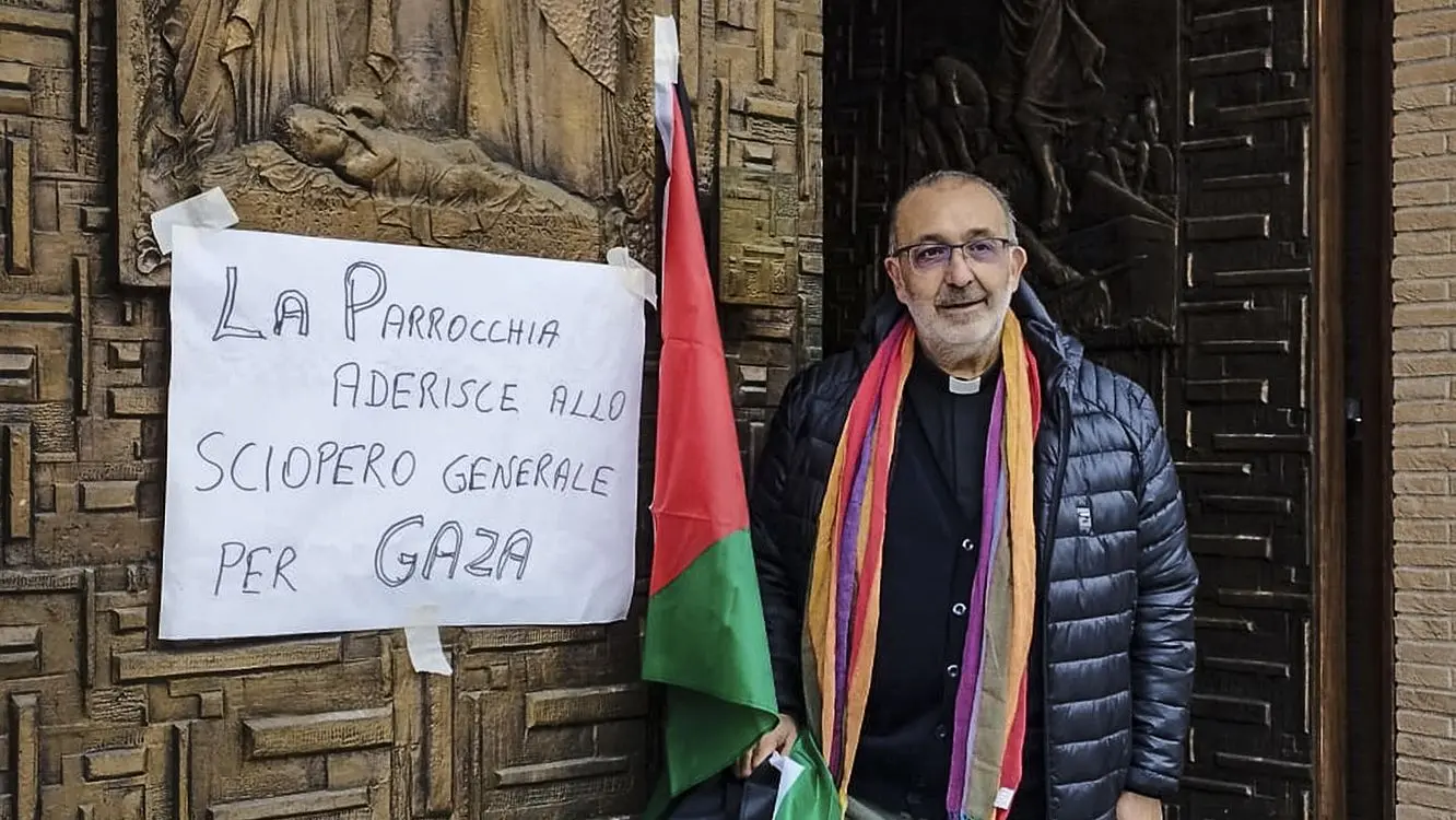 A giugno sull’altare della sua chiesa aveva affisso la bandiera palestinese, oggi sulla porta della chiesa a Mercogliano in provincia di Avellino, di cui è parroco don Vitaliano Della Sala, ha affisso un cartello che non lascia spazio all’incertezza: “La parrocchia aderisce allo sciopero generale per Gaza”.