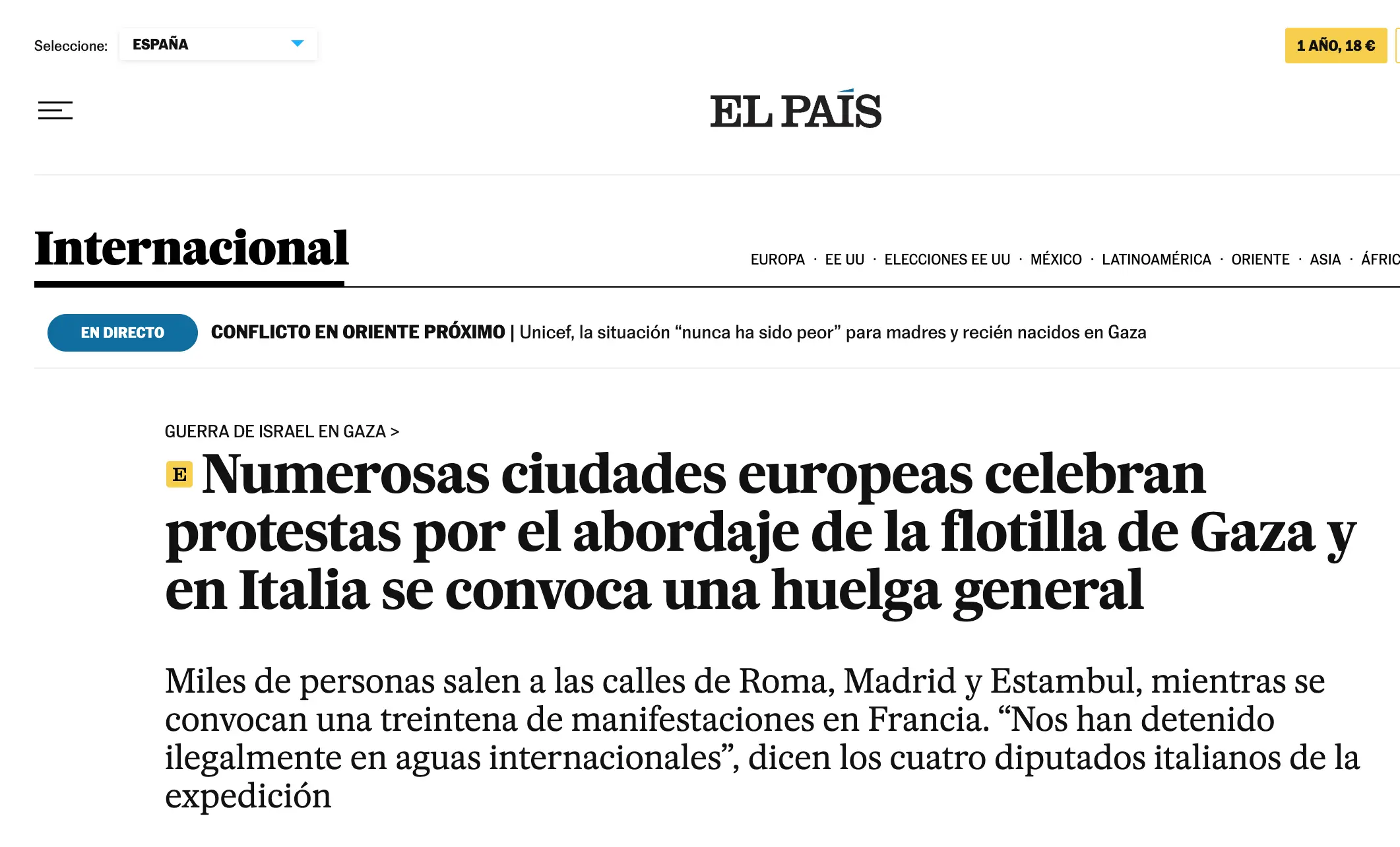 Sempre in Spagna, El País offre una prospettiva più ampia, con il titolo Numerose città europee manifestano contro l’abbordaggio della flottiglia di Gaza e in Italia si convoca uno sciopero generale. Il giornale spagnolo racconta come “Migliaia di persone siano scese in strada a Roma, Madrid e Istanbul, mentre i sindacati italiani hanno chiamato a fermare il lavoro in tutti i settori”. Viene anche citata la testimonianza di alcuni parlamentari italiani presenti sulla flottiglia: “Siamo stati detenuti illegalmente in acque internazionali. È stato un atto di pirateria contro cittadini disarmati”.