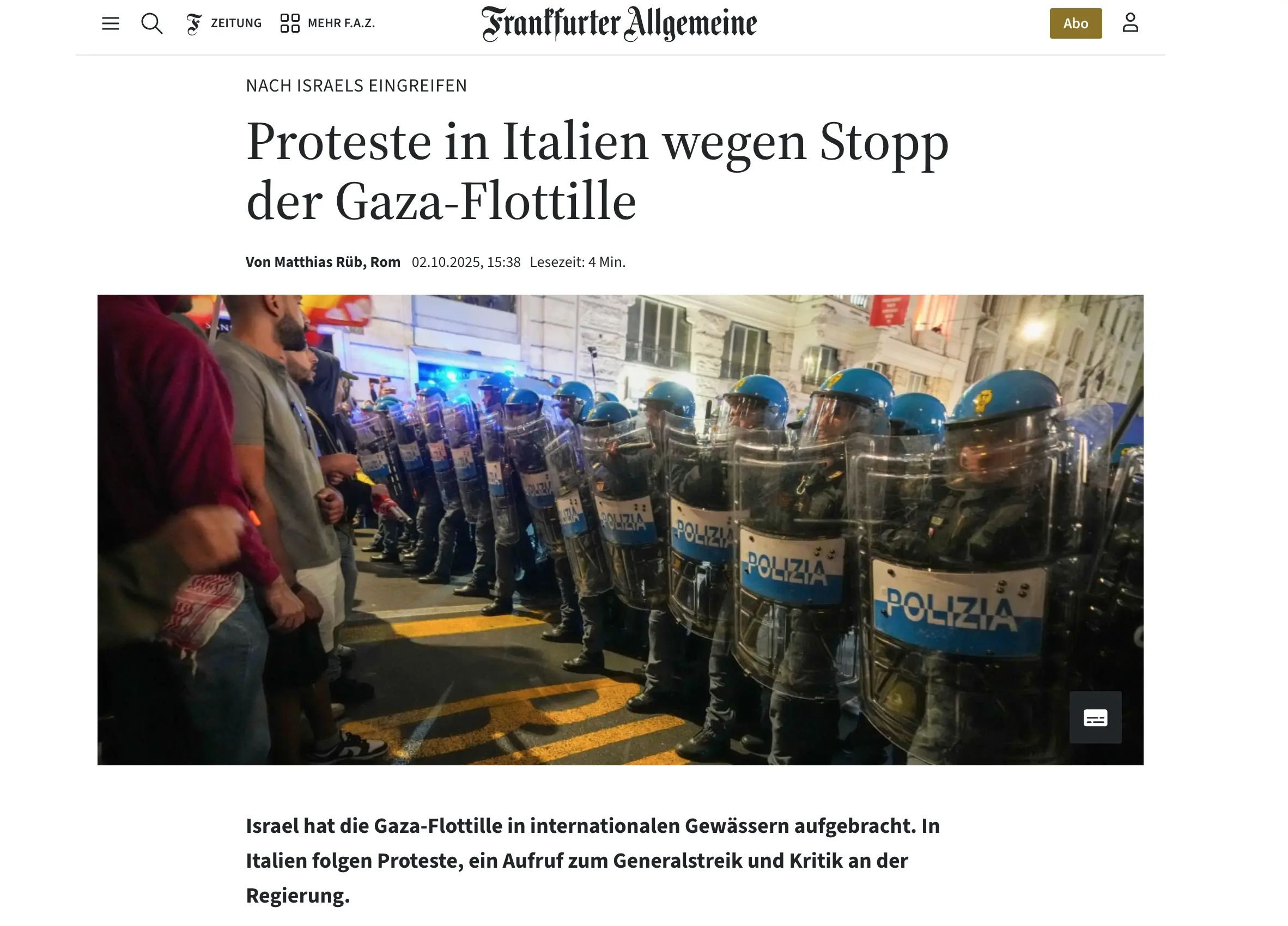 Il quotidiano riporta come “il punto nevralgico della giornata sia la manifestazione che unisce Piazza Vittorio a Roma con Piazza del Cinquecento, la grande spianata che precede la principale stazione ferroviaria della capitale. L'obiettivo è protestare contro l'intercettazione da parte dell'esercito israeliano delle 43 navi che componevano la Global Sumud Flotilla, dopo aver attraversato il Mediterraneo dai porti di Spagna, Tunisia e Italia per portare aiuti umanitari a Gaza”.