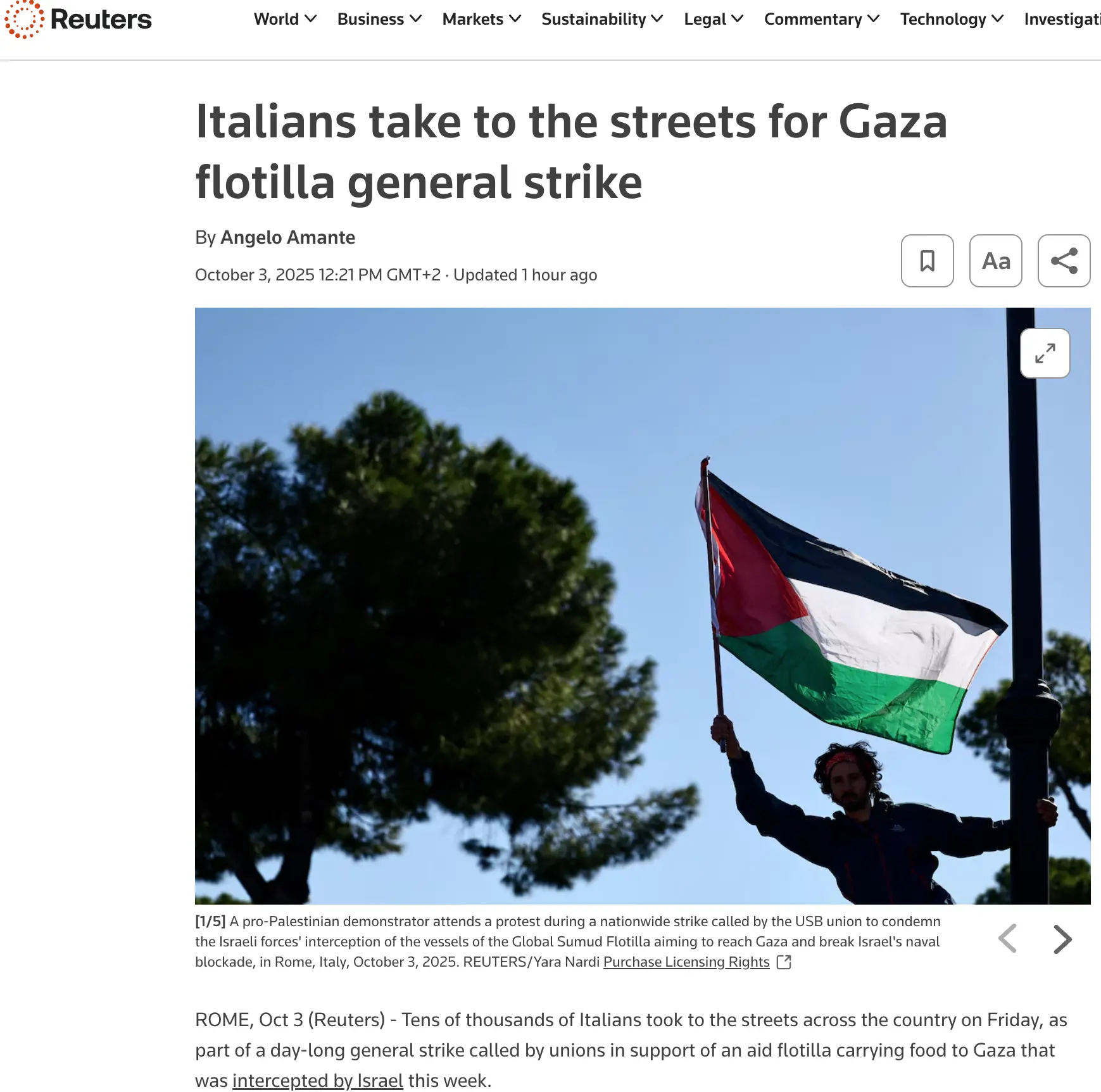Reuters: “Gli italiani scendono in piazza per lo sciopero generale sulla flottiglia di Gaza”
